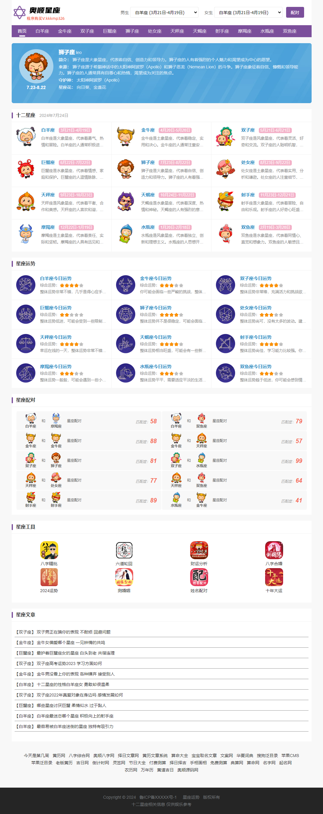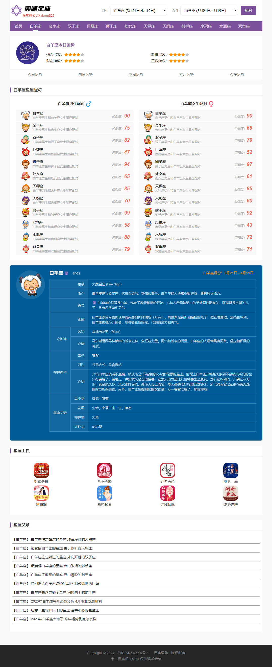 - 7、页面底部的星座工具板块,里面跳转到的付费测算是广告链接,不在本程序内,广告随机调用,程序内可修改。