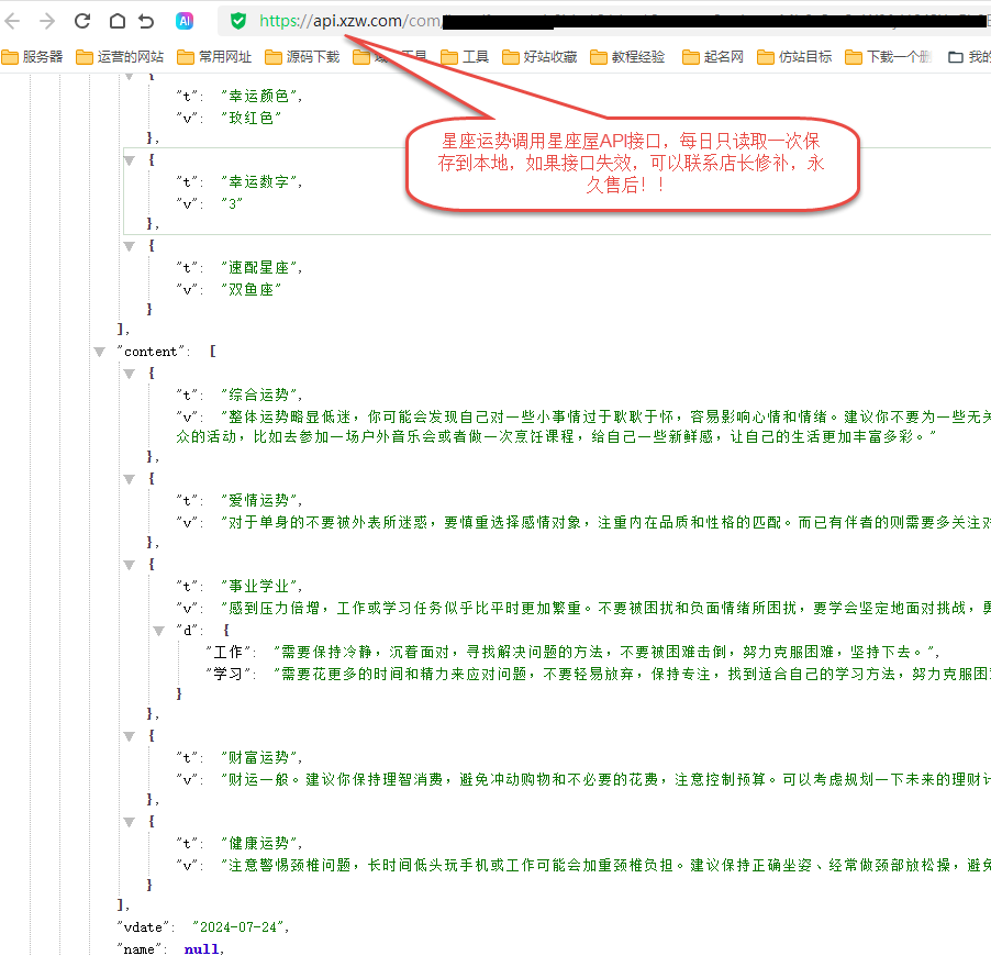 - 2、每日运势/当月/当年星座运势调用星座屋API接口,每天只采集一次接口,后保存到本地调用本地保存的运势数据。(接口万一失效可以联系店长修补,yongjiu售后)