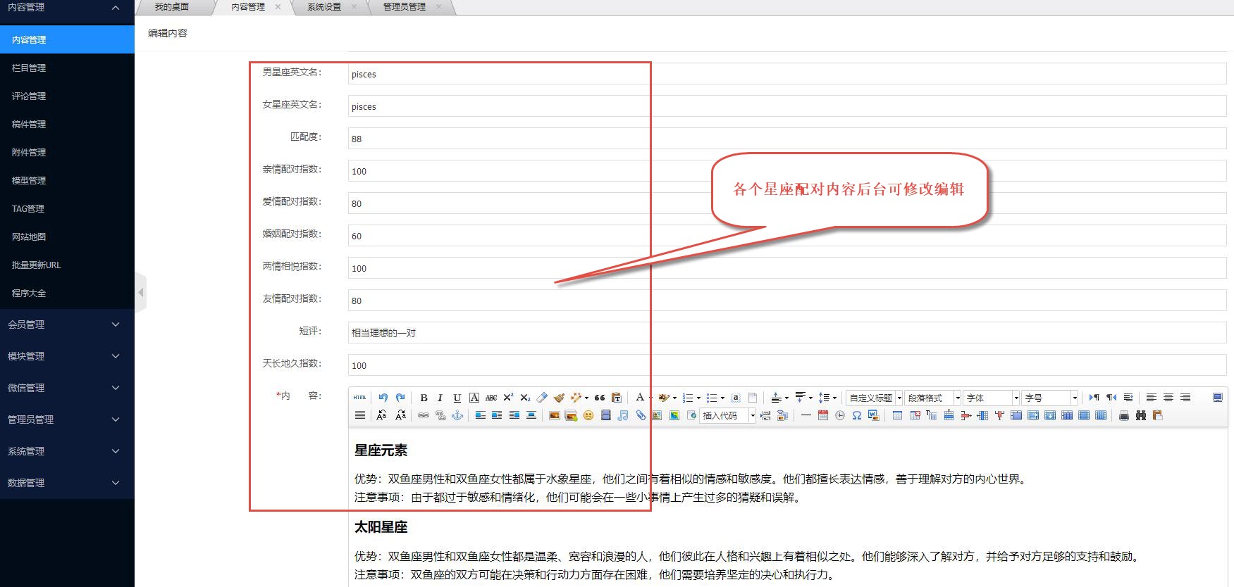 - 3、各个星座的配对数据后台可编辑修改,单独一个数据表,和文章数据表分开。