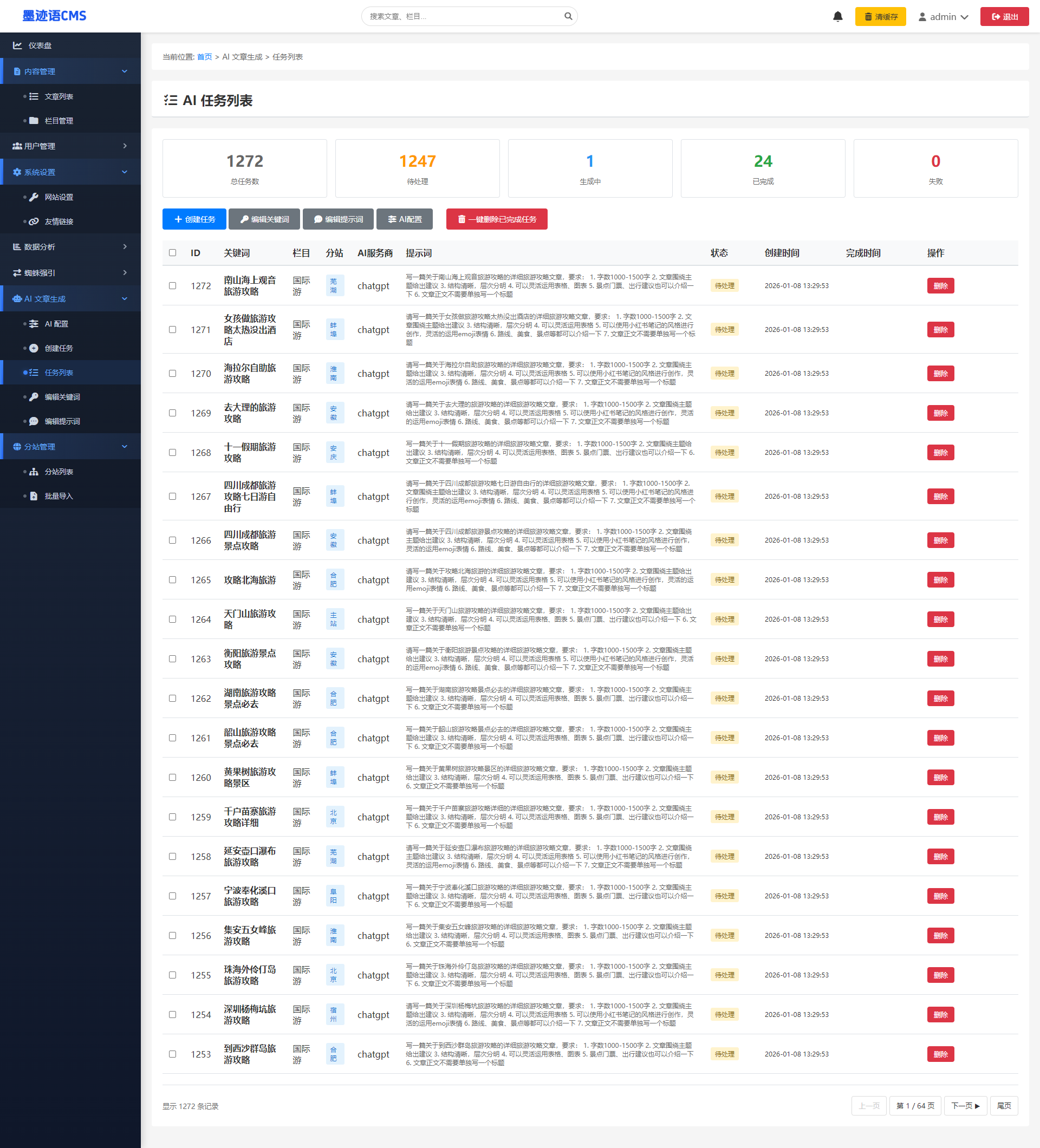 4、自动分发:不同的栏目不同的关键词库,不同的提示词库。