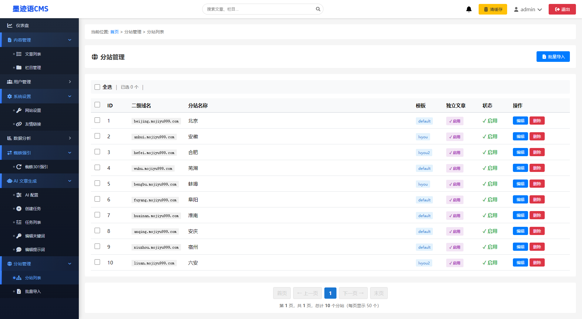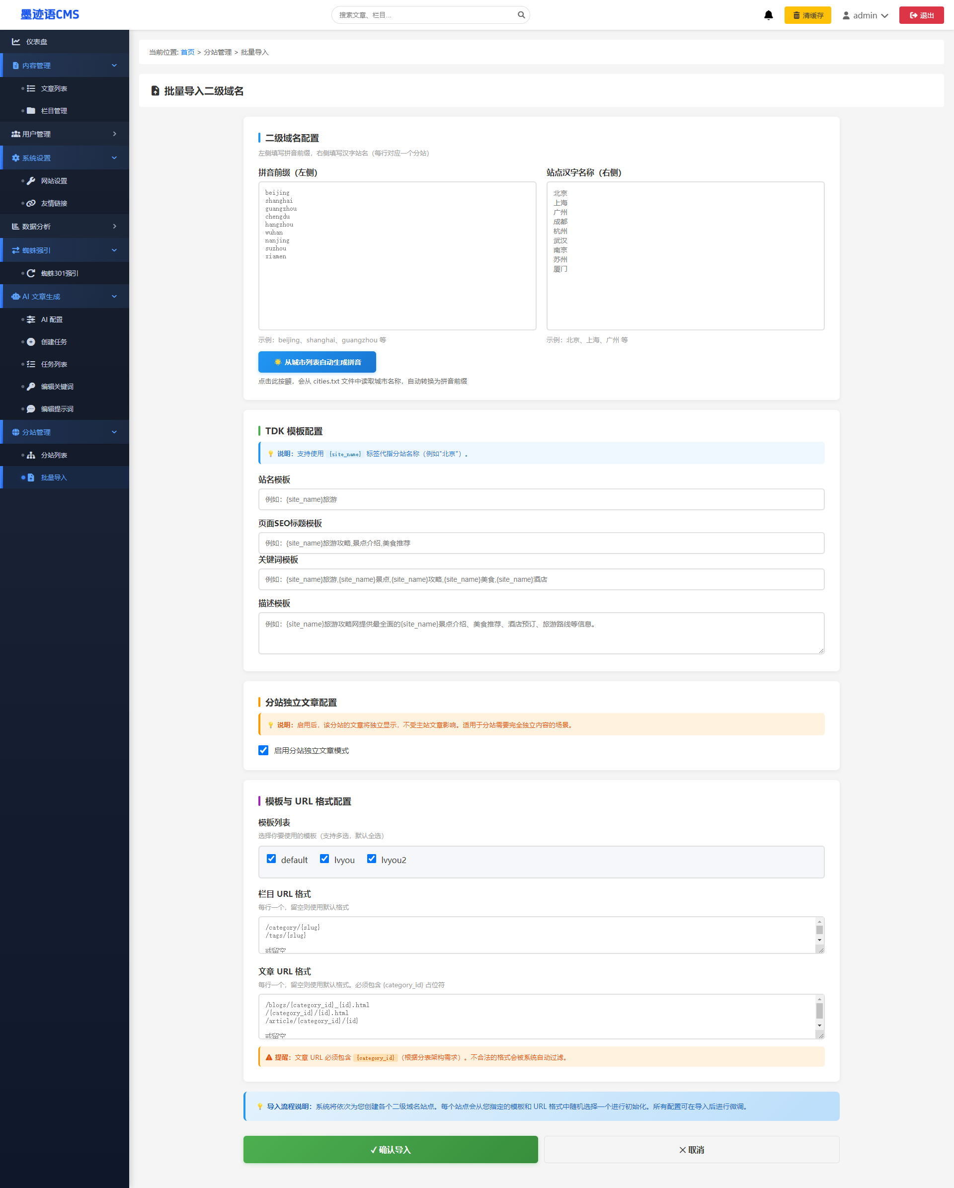 1、批量导入:内置强大的分站生成算法。您只需导入城市名或自定义前缀列表,系统即可配合预设的 TDK 模板,在数秒内瞬间生成成百上千个合法二级分站。