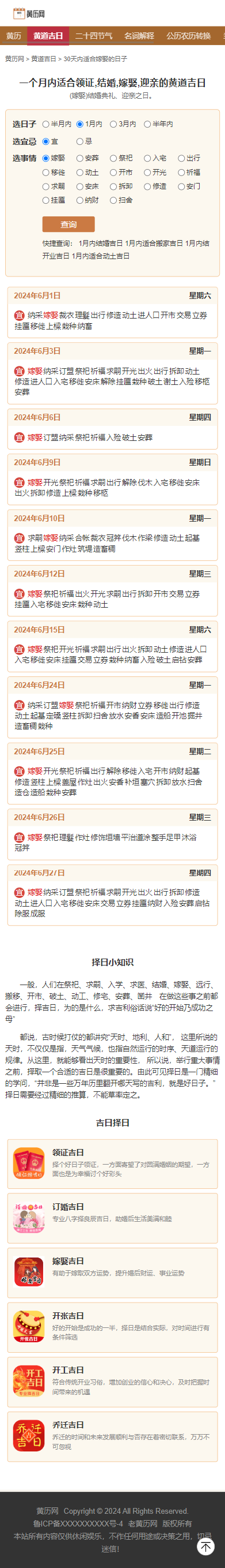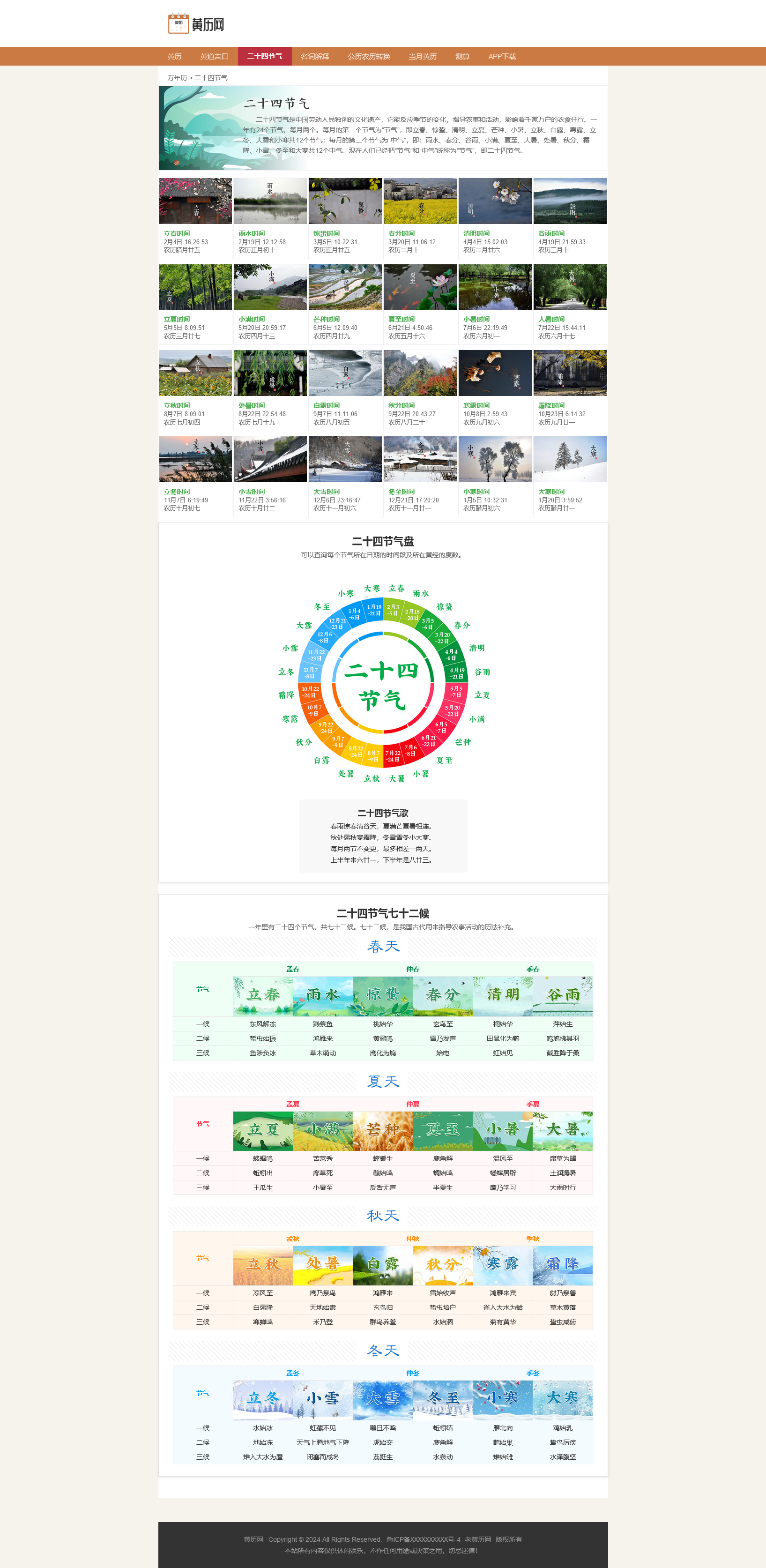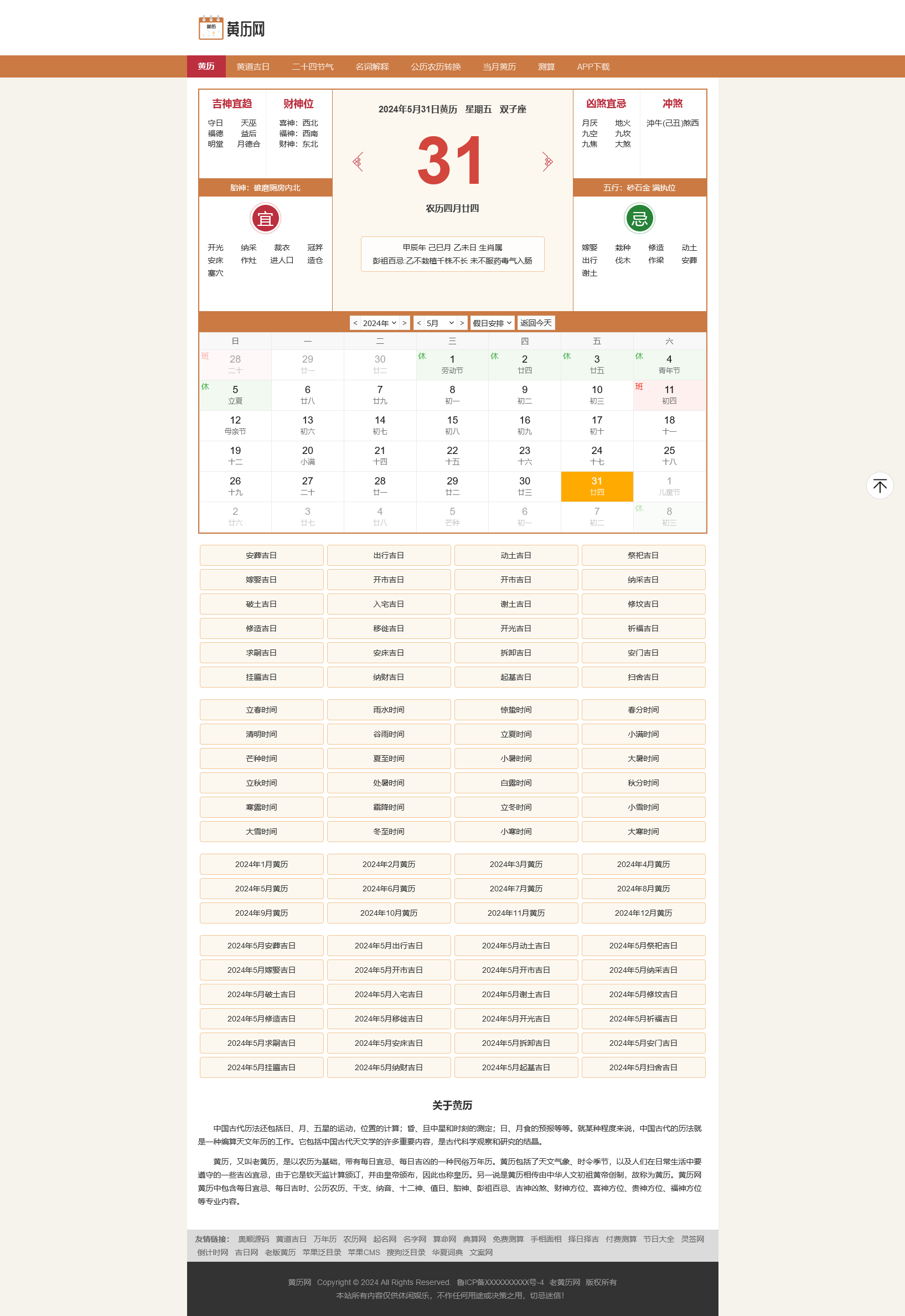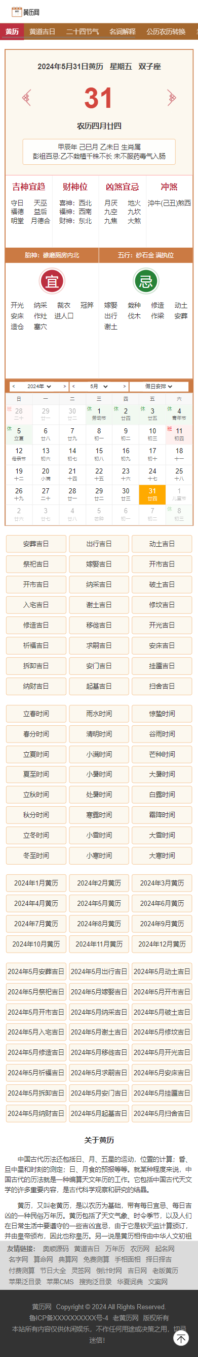 - 2、首页增加二十四节气、当年每月日历表、当月黄道吉日、近期黄道吉日的汇总导航。