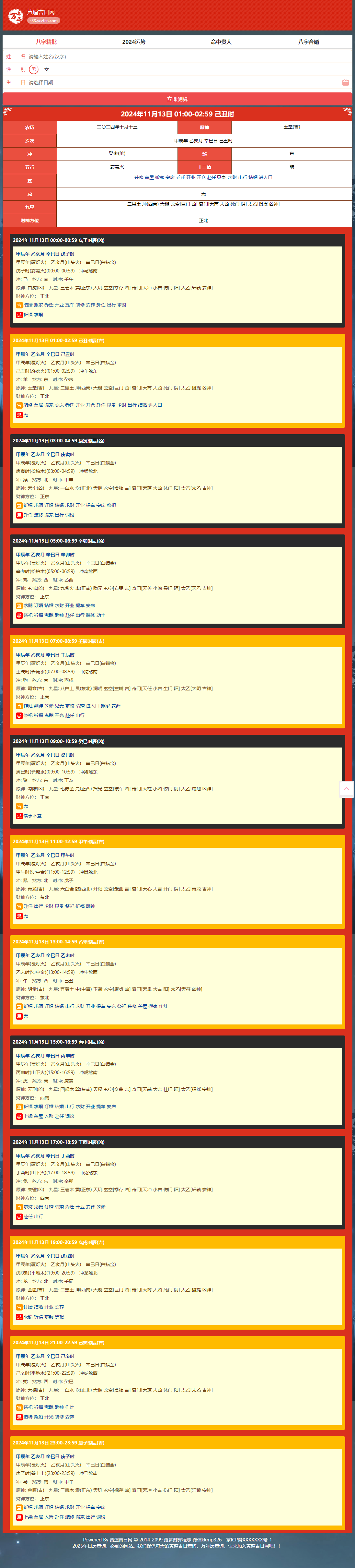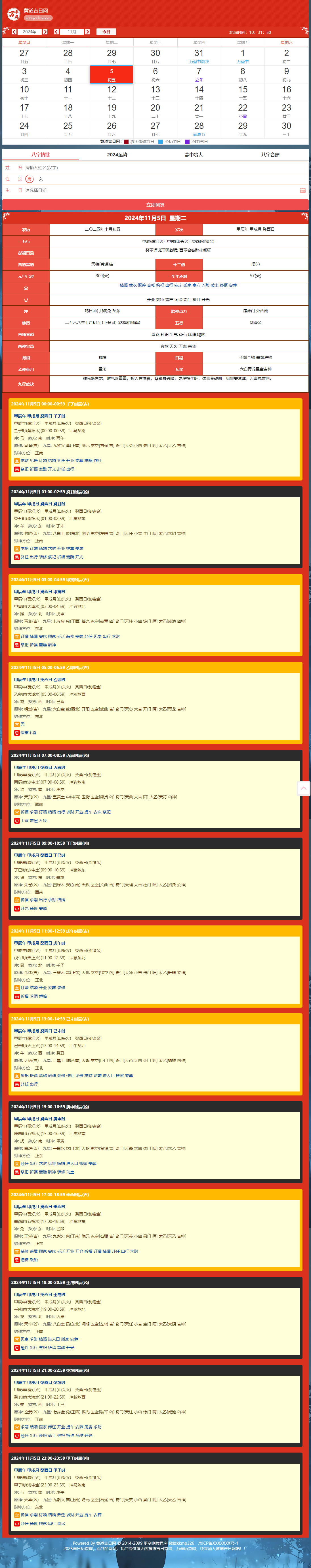 - 4、页面自动生成黄历宜忌信息,并链接至相关信息的查询结果页面,页面内容根据当前的时间不同,展示的不同,实现页面自动更新。