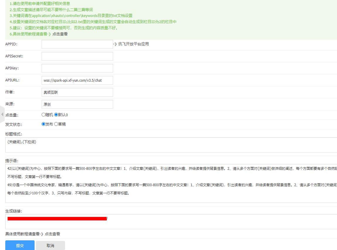 打开模块管理-》文章生成,设置APPID,APPSecret,APIKey。