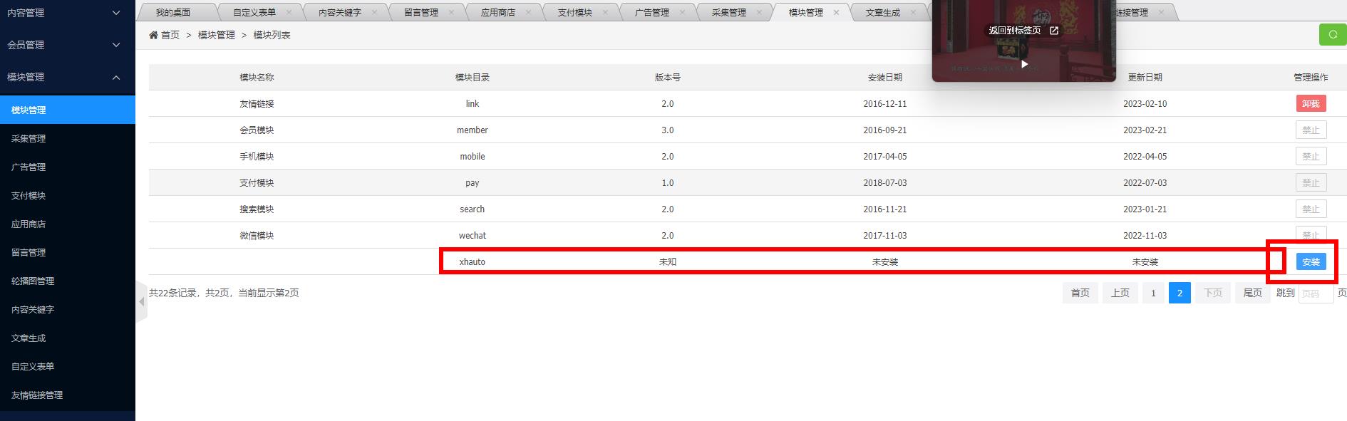 模块管理,找到xhauto,点击安装。