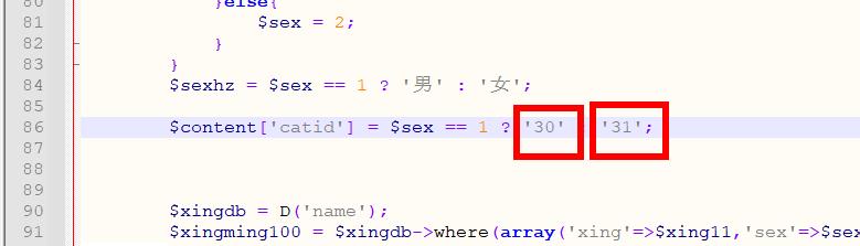 (1)、姓氏起名文章生成:修改文件application\qmadd\controller\qmadd.class.php86行,30表示男生文章导入的栏目id,31表示女生文章导入的栏目id