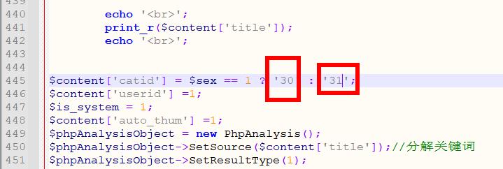 (2)、定字起名文章生成:修改文件application\qmadd\controller\qmadd.class.php445行,30表示男生文章导入的栏目id,31表示女生文章导入的栏目id