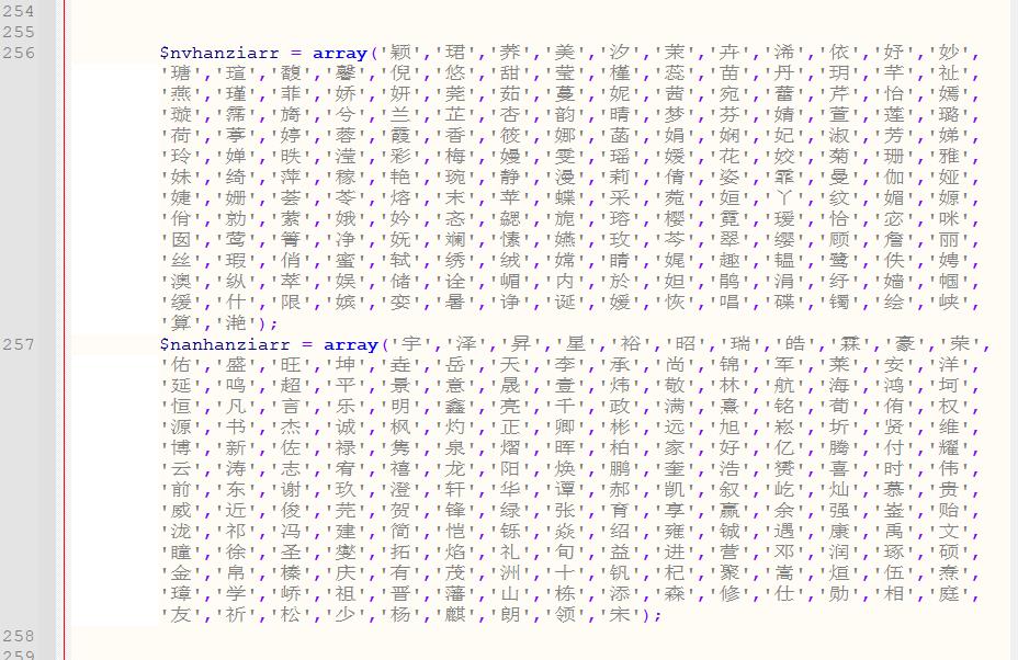 (2)、定字起名文章生成:修改文件application\qmadd\controller\qmadd.class.php 257行 修改或者添加起名常用字。