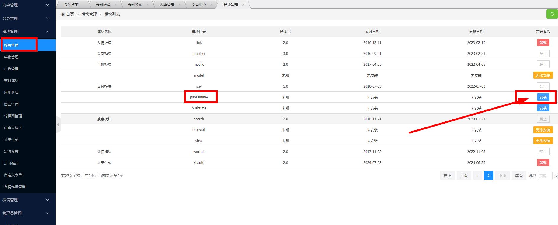 在后台模块管理里进行安装,安装后刷新后台,然后打开模块管理就能看到了