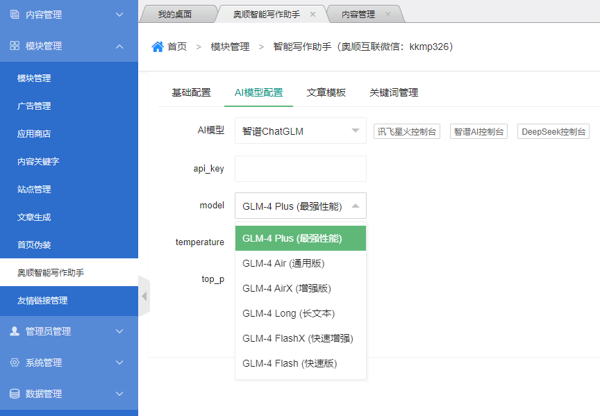 - 智谱ChatGLM: 需配置API密钥,可选择不同版本模型