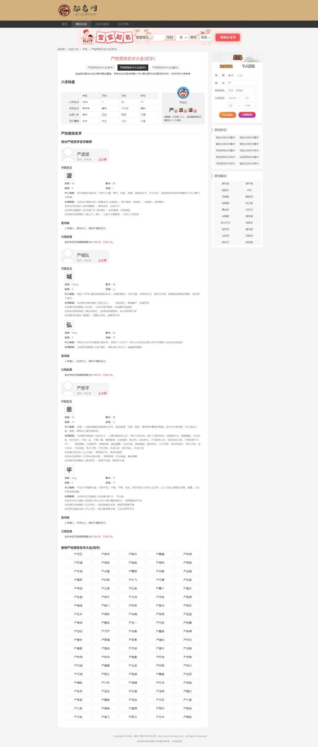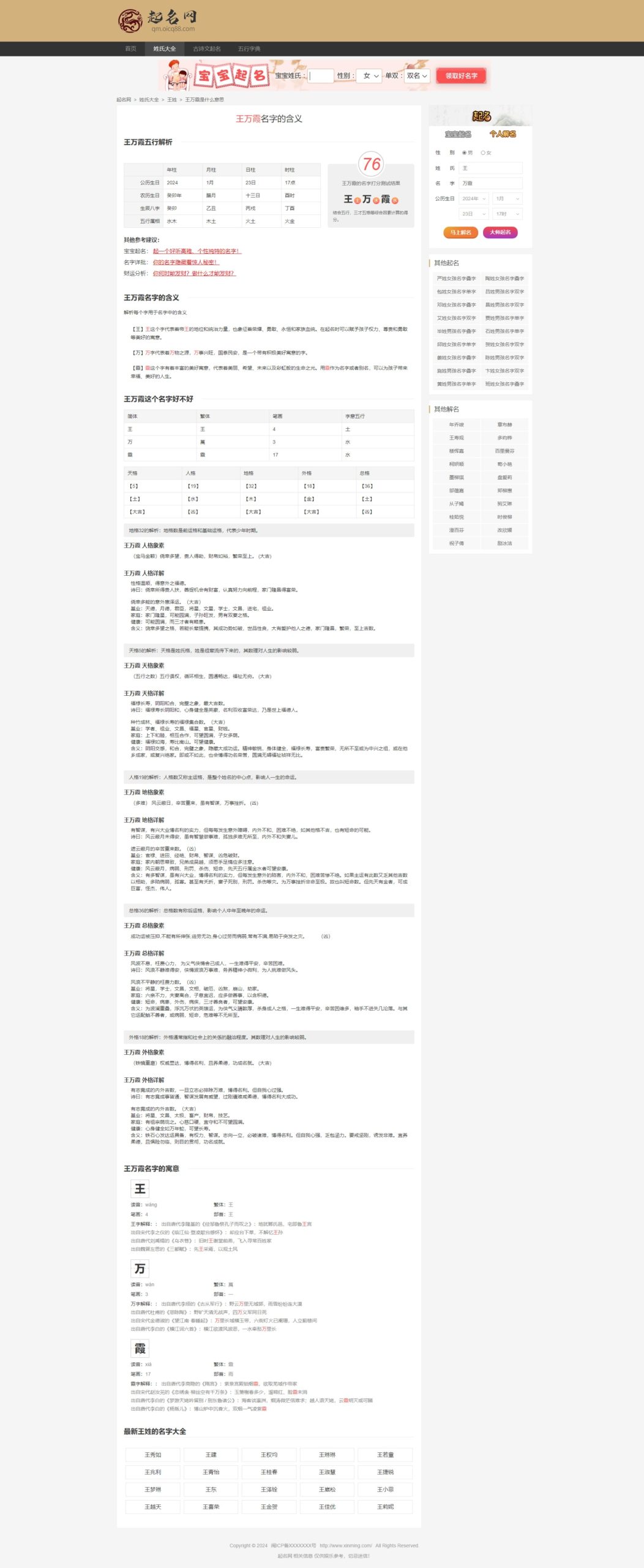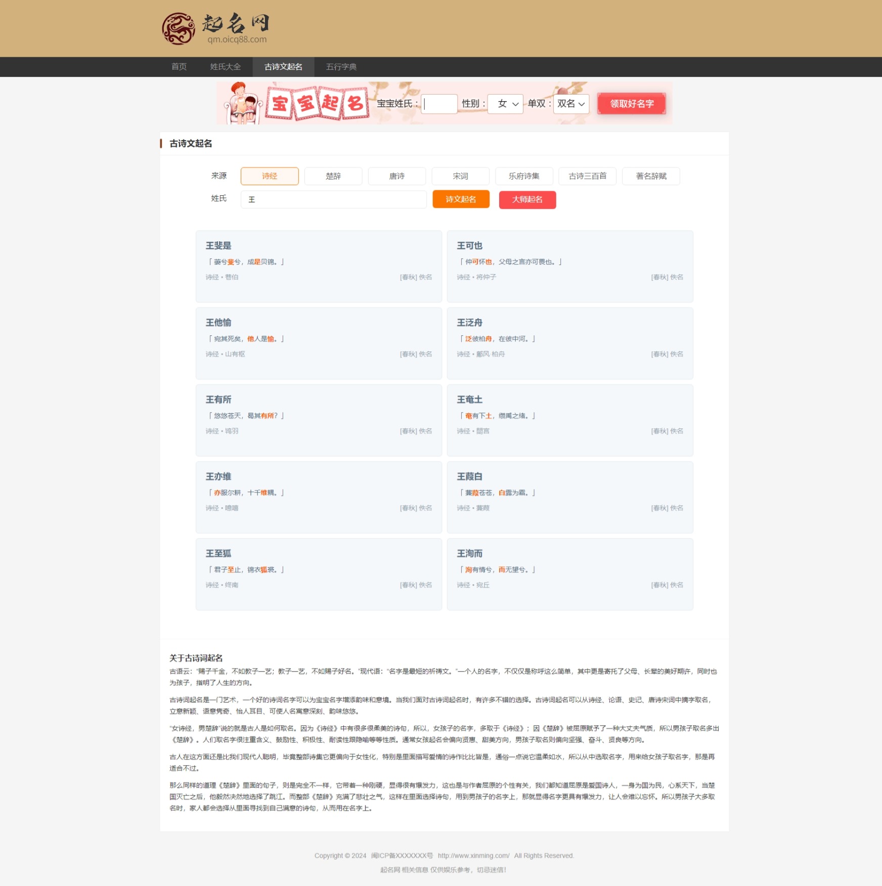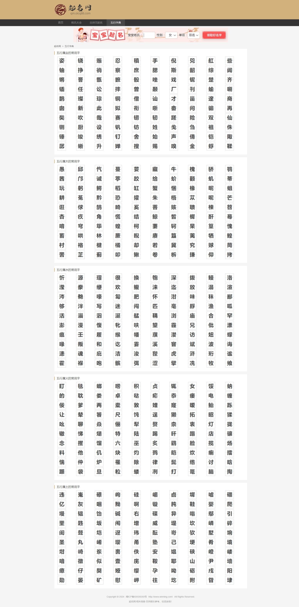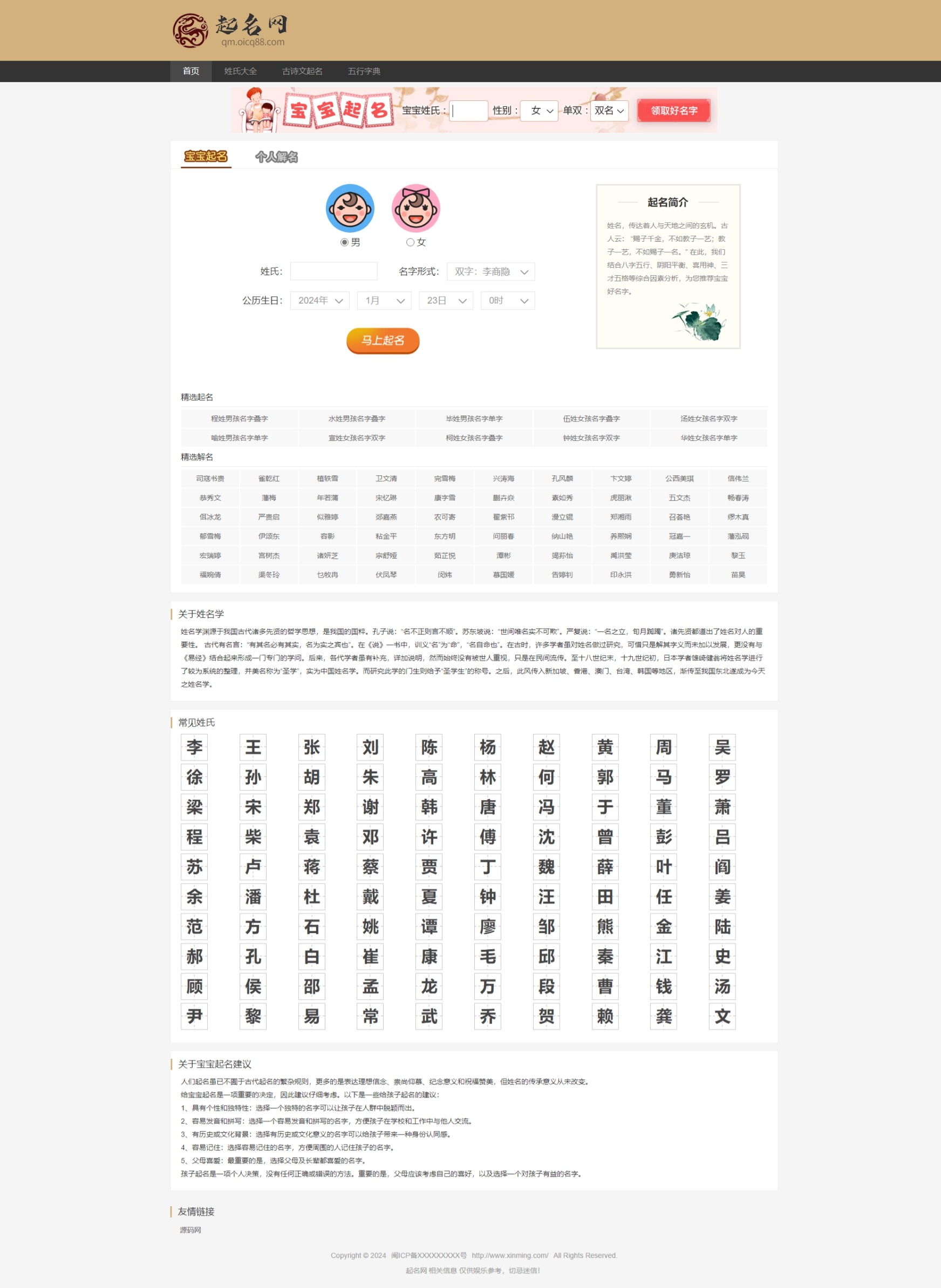 - 起名内容来源数据库,通过客户提交的姓名,出生年月日表单,计算出用户的五行缺旺,然后从数据库中调用五行相符的姓名提供给客户。并且包括:单字,双字,叠字的三种选择!