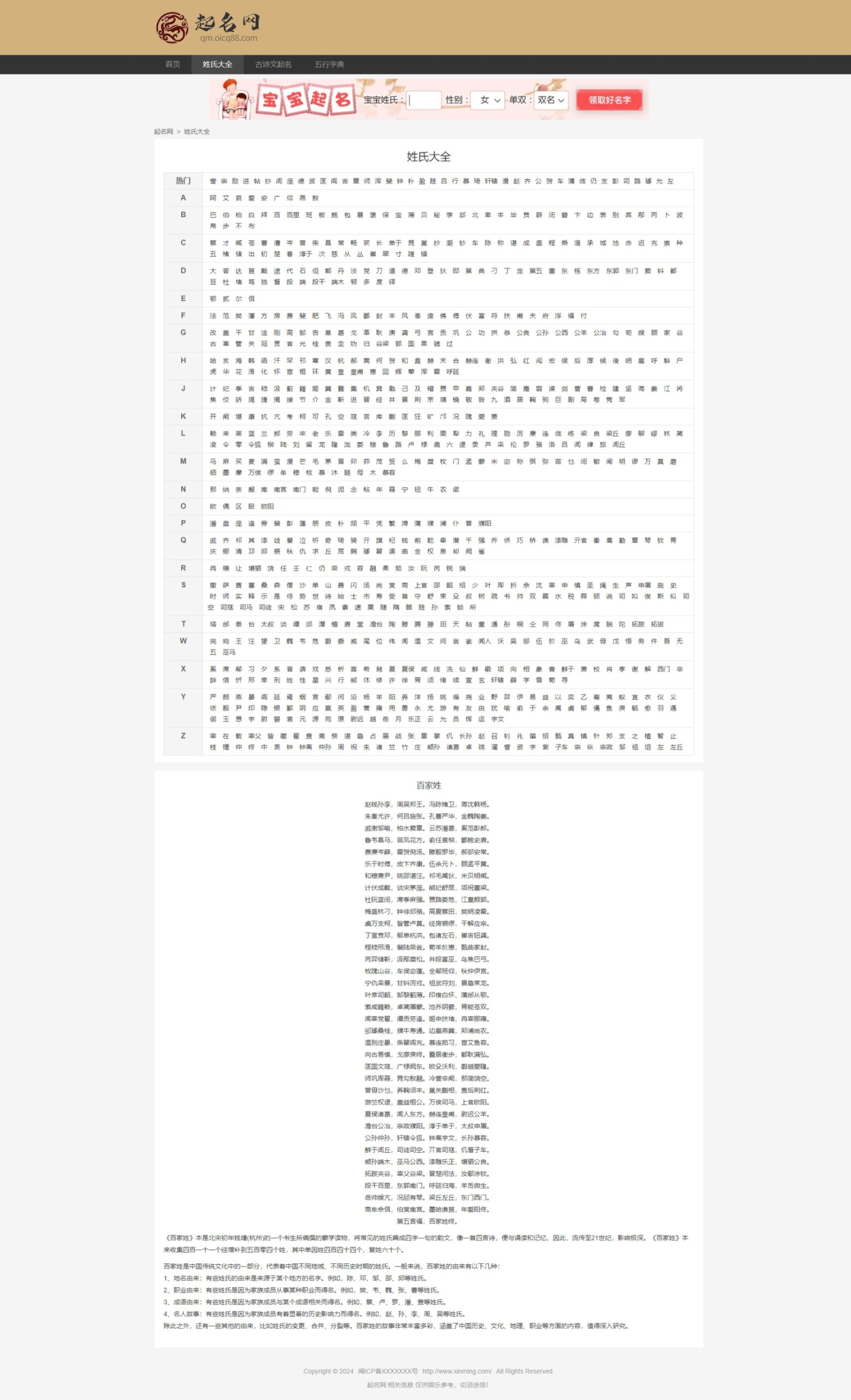 - 百家姓页面分字母排序,涵盖了几乎所有的姓氏。