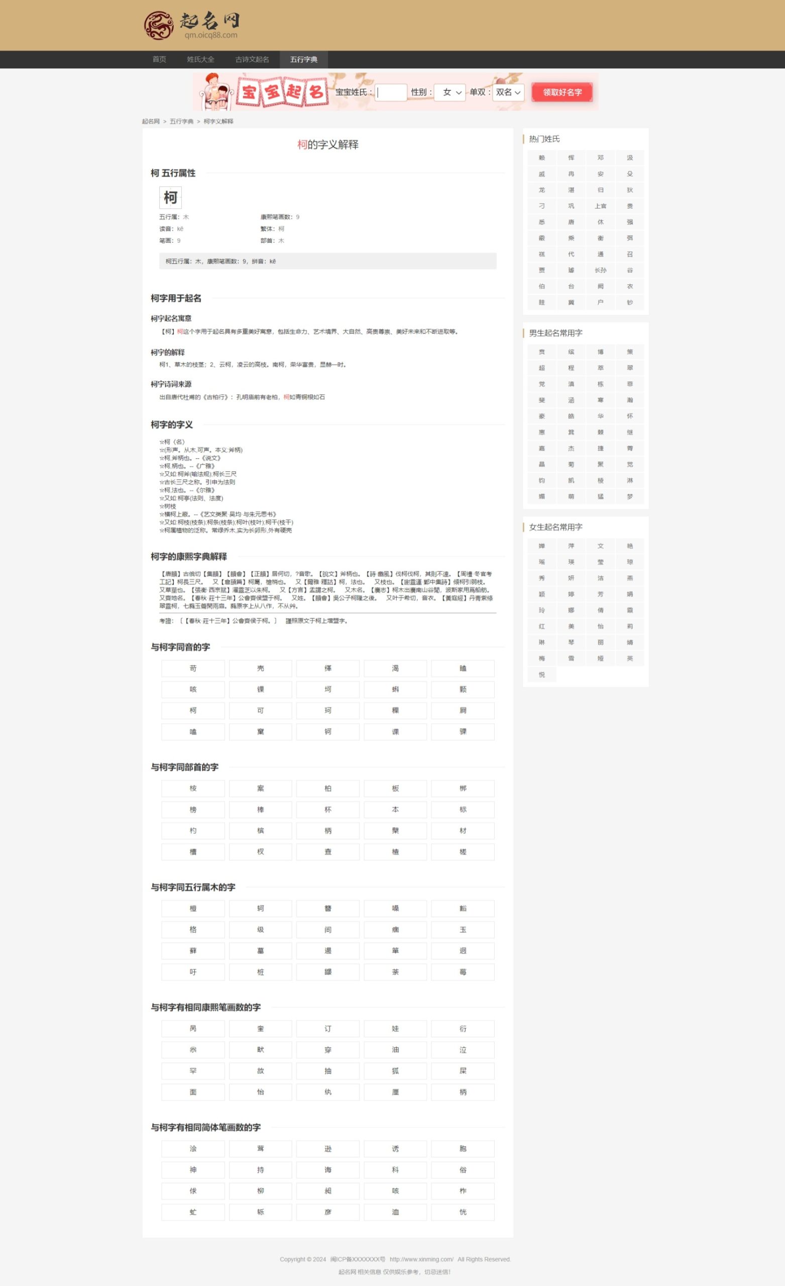 - 汉字详解页面,给出了汉字的属性,取名寓意,诗词来源,字义,康熙字典解释,多种来源聚合,适合seo。