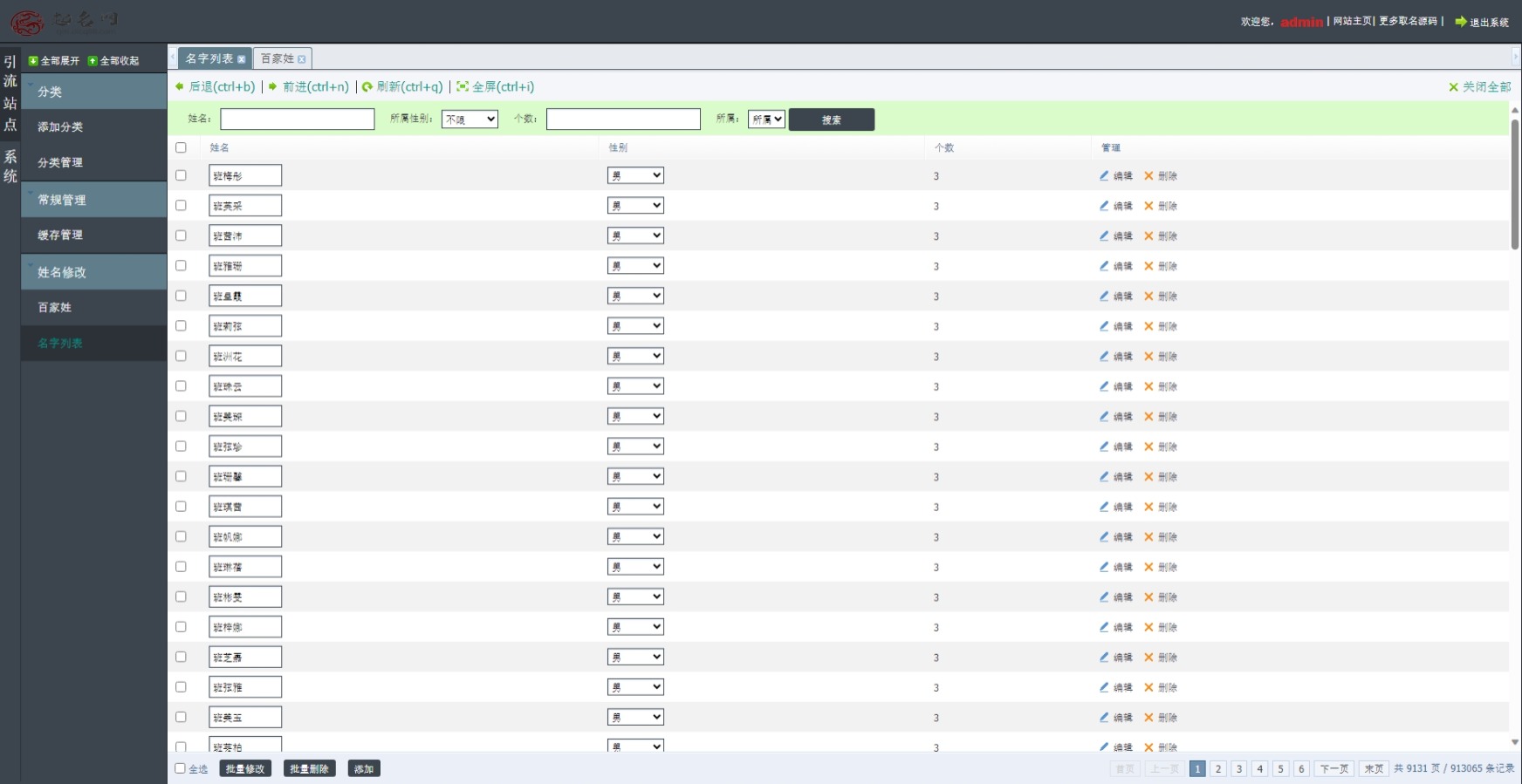- 后台功能比较简单,标题,关键词,描述信息需要在模板里修改。后台只有增加姓名姓氏的功能,功能比较简单,具体数据库操作可以使用phpmyadmin。